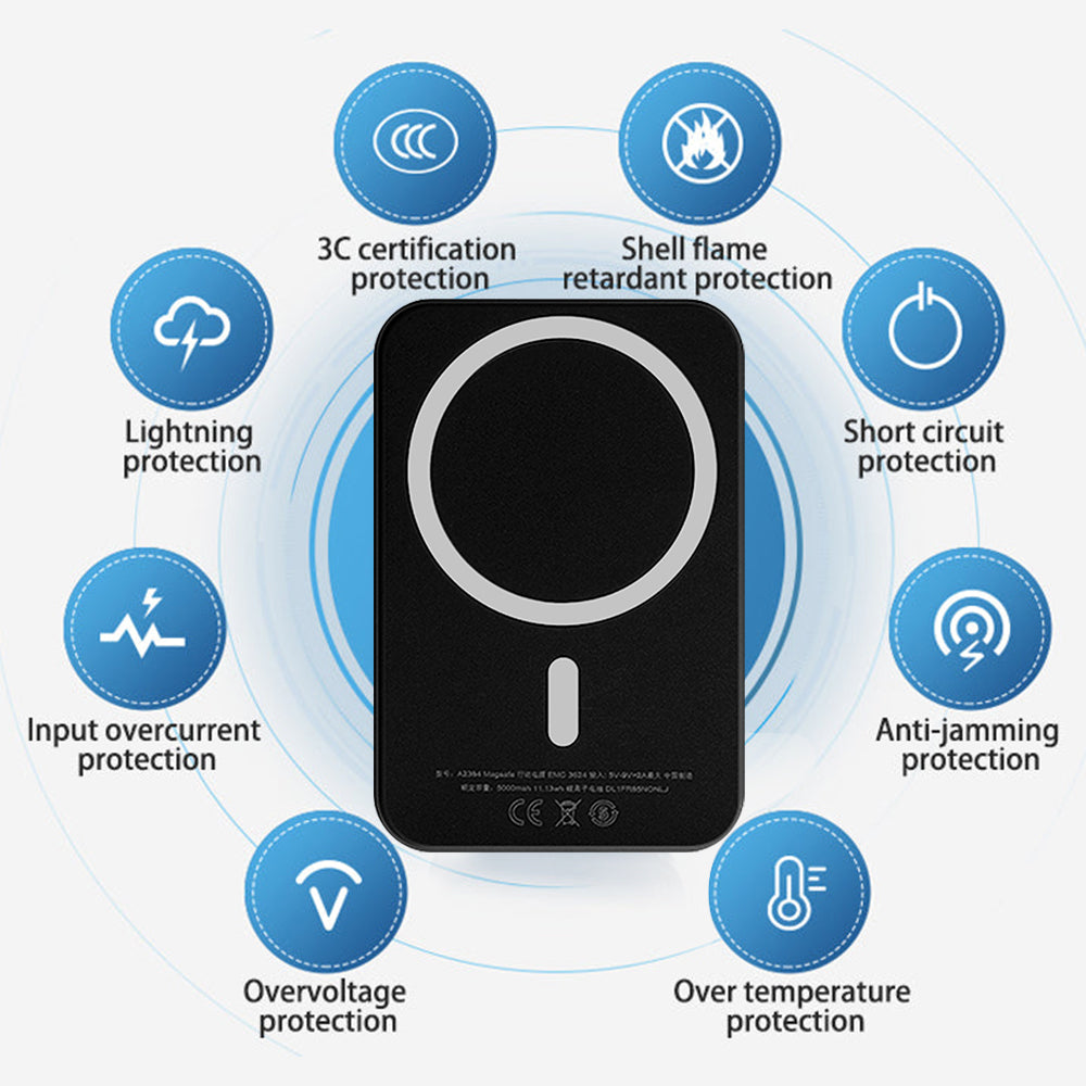 A: The wireless power bank can only charge iPhone 12/13 series (the charging method is magnetic wireless charging), other mobile phones without magnetic suction function need to use the data cable to transfer and charge.