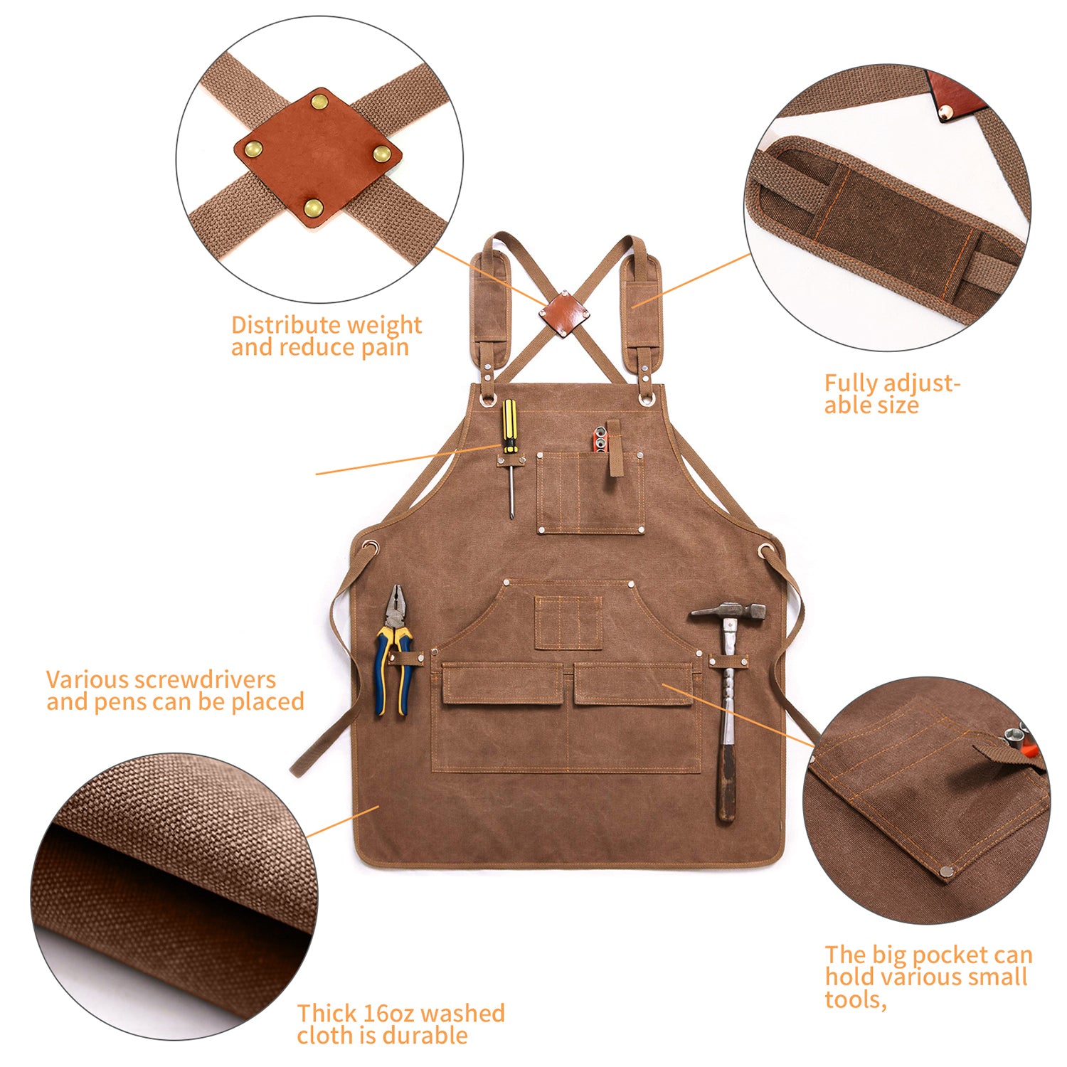 | High Quality Canvas Apron: Our tool apron is made of 16 OZ Canvas, ouble stitched tool pockets and thick top and bottom hems,heavy duty,thick,durable to withstand tough painting, woodworking, gardening, BBQ, cleaning, home. |