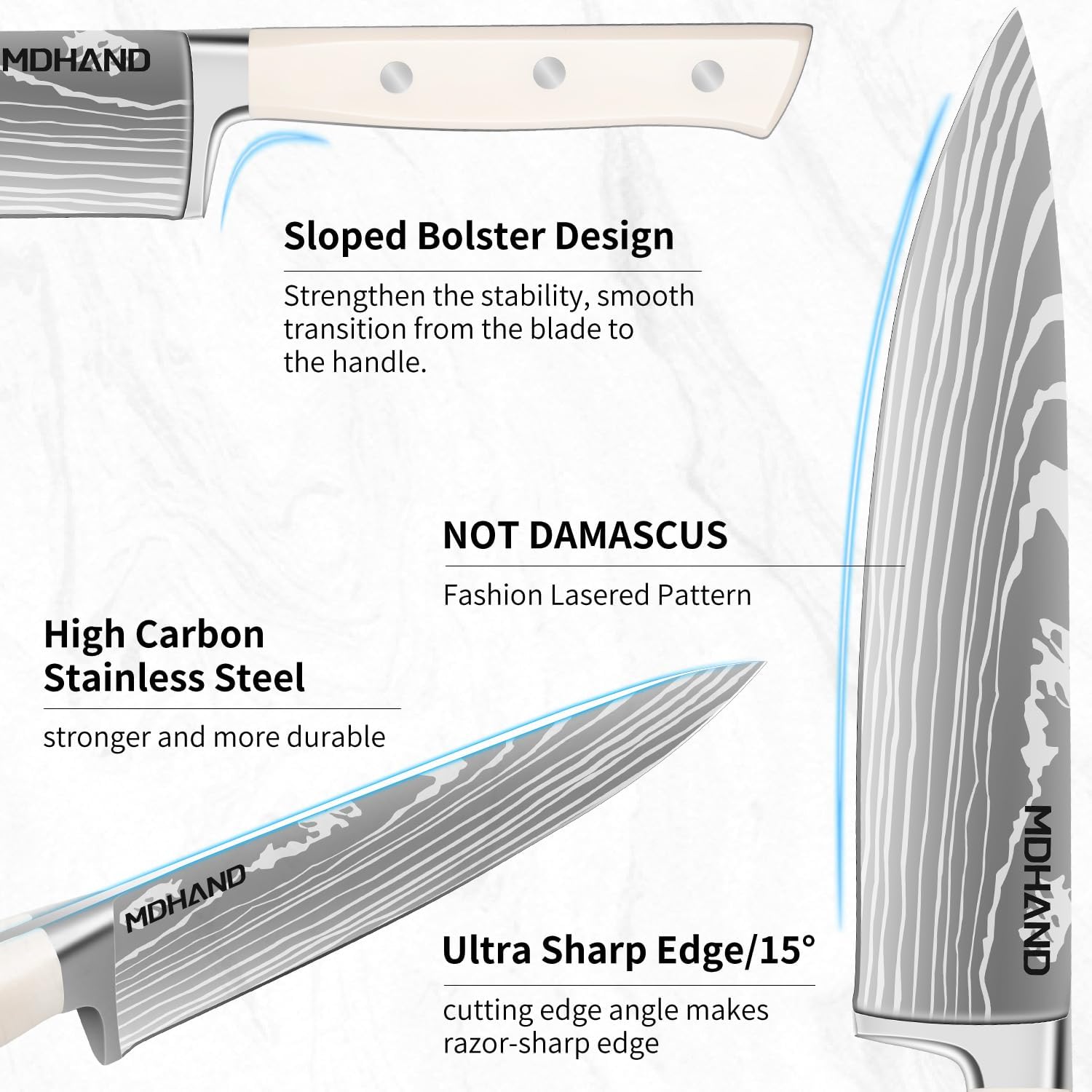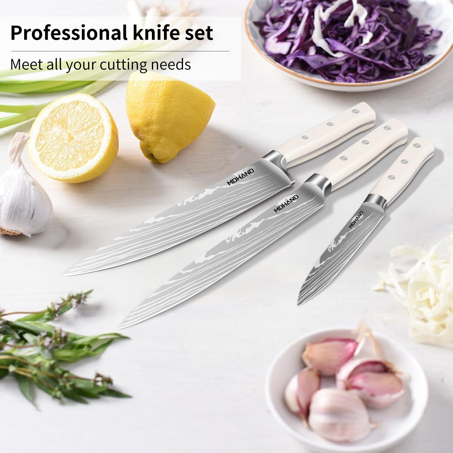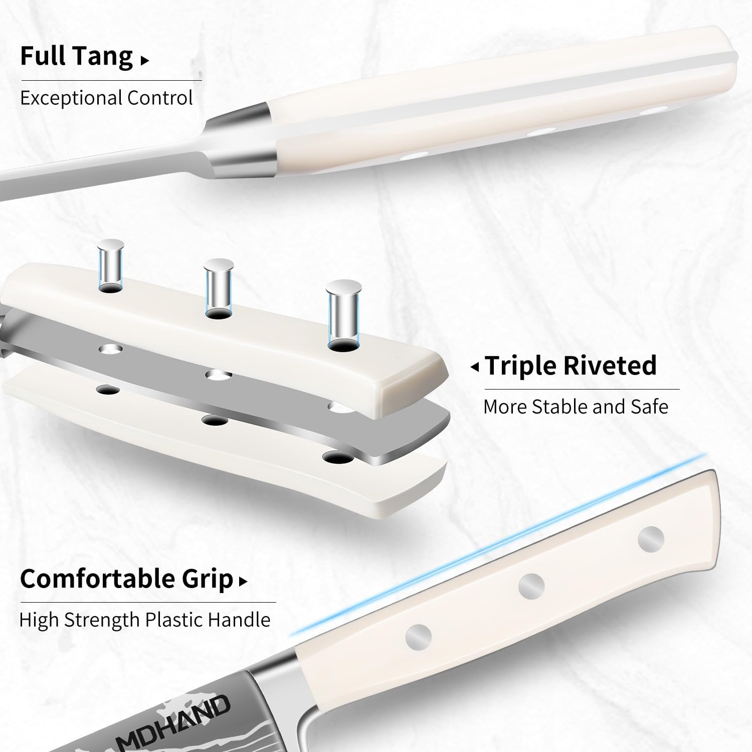 - Angenehmes Handgefühl: Der Küchenmesserset ergonomische Pakka-Holzgriff wird verwendet, das Handgefühl ist angenehm und Sie werden nicht müde, lange in der Küche zu arbeiten.