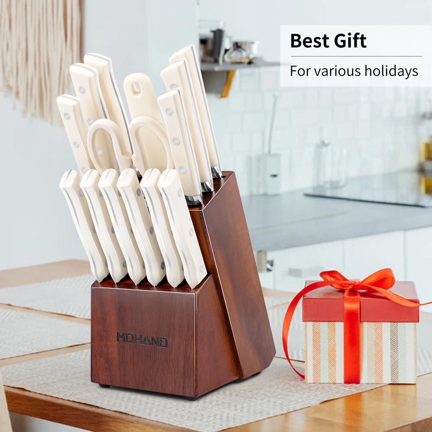 - 14 Teiliges Küchenmesser Set mit Messerblock:Messerset mit Messerblock Das Paket enthält Kochmesser, Brotmesser, Tranchiermesser, Santokumesser, Küchenschere, Allzweckmesser, Schneidemesser, 6-teiliges Steakmesser, Schärfer,Messerblock. Ideale Ausstattung für die Küche.